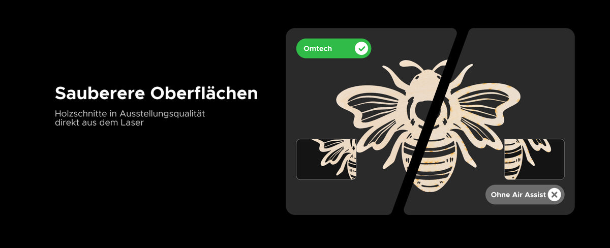 Mit dem präzisen Luftstrom entstehen glatte Holzoberflächen mit deutlich weniger Schmauchspuren. Unschöne Brandkanten gehören der Vergangenheit an – Ihre Projekte sehen direkt nach dem Schneidevorgang aus wie ausgestellt.