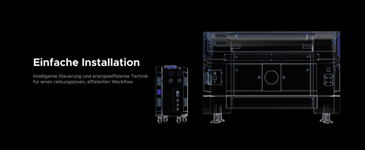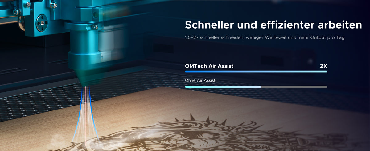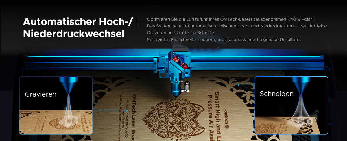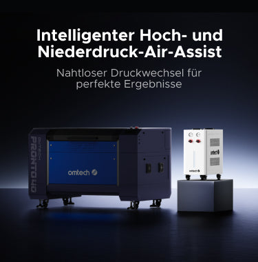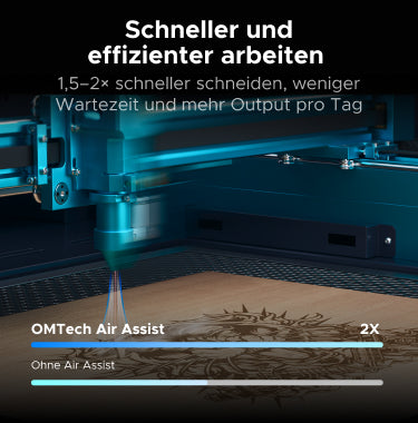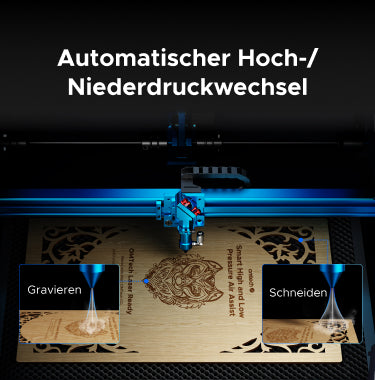 Die intelligente Air-Assist-Steuerung liefert einen konstanten Luftstrom von 80 L/min zur effektiven Rauch- und Partikelabfuhr. Das Modul wechselt automatisch zwischen Hochdruck (Schneiden) und Niederdruck (Gravieren) – für perfekte Ergebnisse bei Materialien wie Furnier, Holz und mehr.